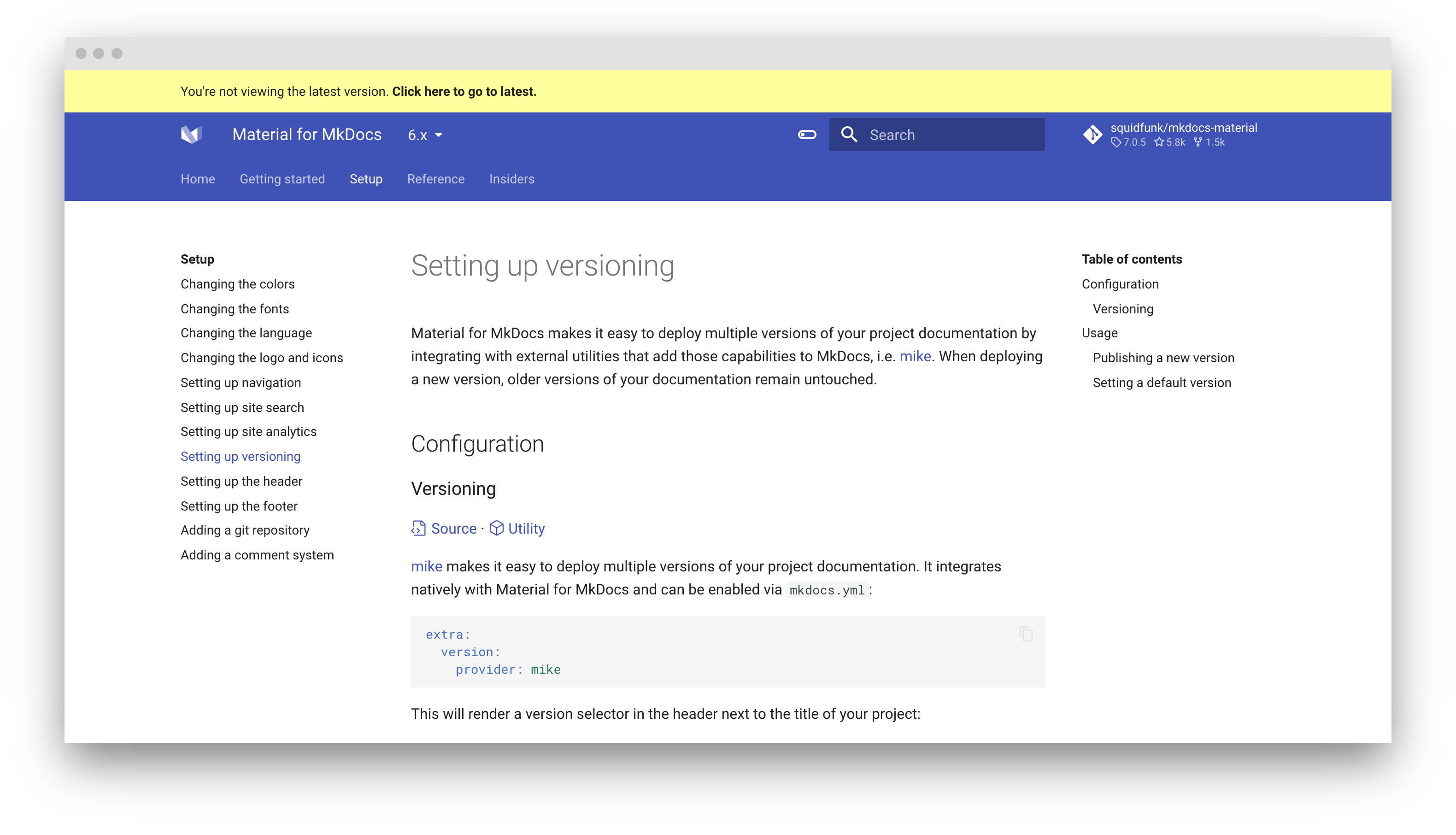 Material for MkDocs makes it easy to deploy multiple versions of your project documentation by integrating with external utilities that add those capabilities to MkDocs, i.e. mike. When deploying a new version, older versions of your documentation remain untouched.